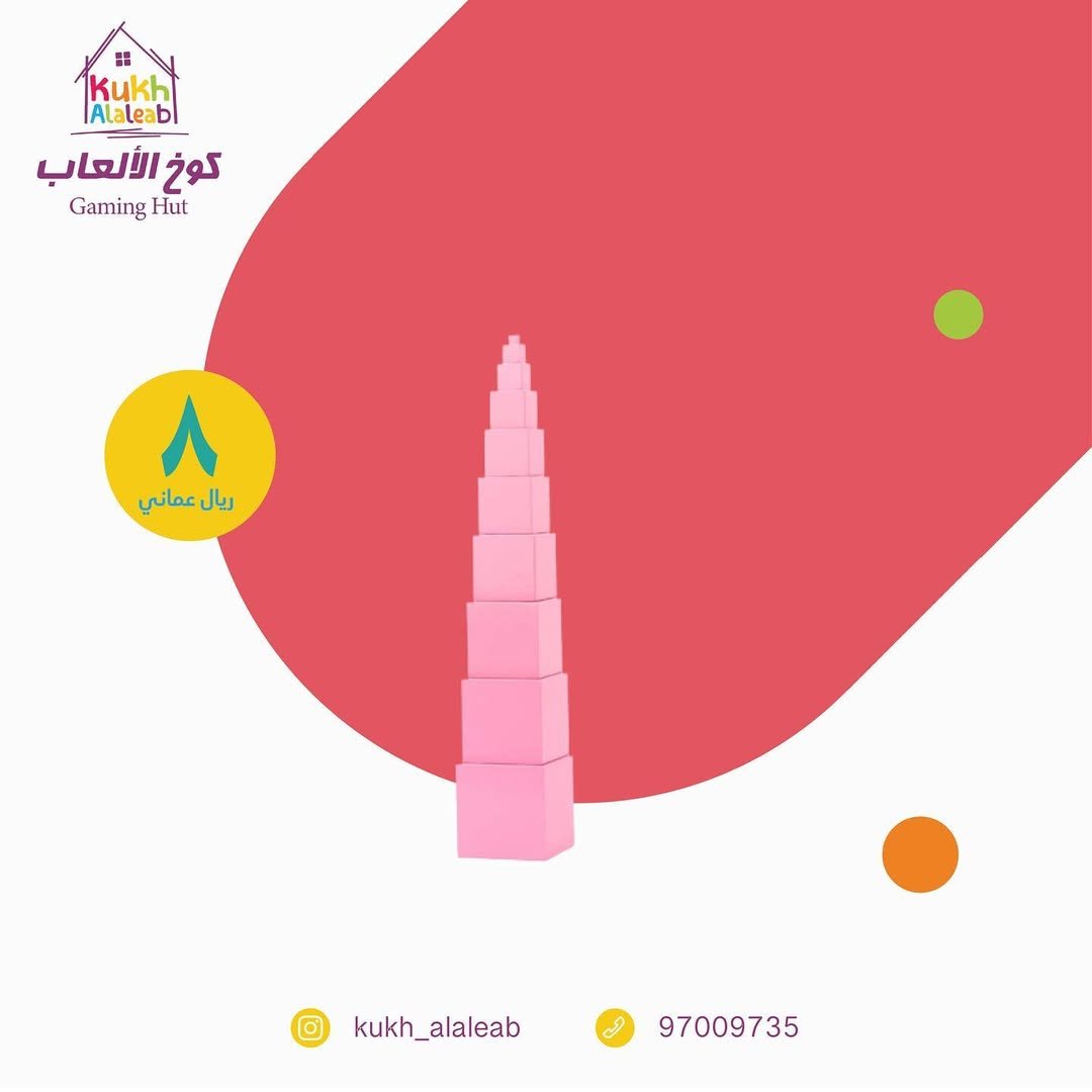 البرج الوردي من ألعاب المنتسوري التي تساعد الطفل على معرفة إختلاف الأحجام من خلال صفها فوق بعضها ، إدراك إختلاف الأوزان المصاحب لإختلاف الأحجام, تهيئة للحساب من 1-10 عشر, مكعبات تهيئة للنظام العشري , أكبر مكعب يستوعب ليتراً من السوائل ، يقوم الطفل بصف المكعبات فوق ، كما انه يساعد تصوير مهارات الطفل الحركية الدقيقة وقدراته على حل المشكلات أثناء اللعب .